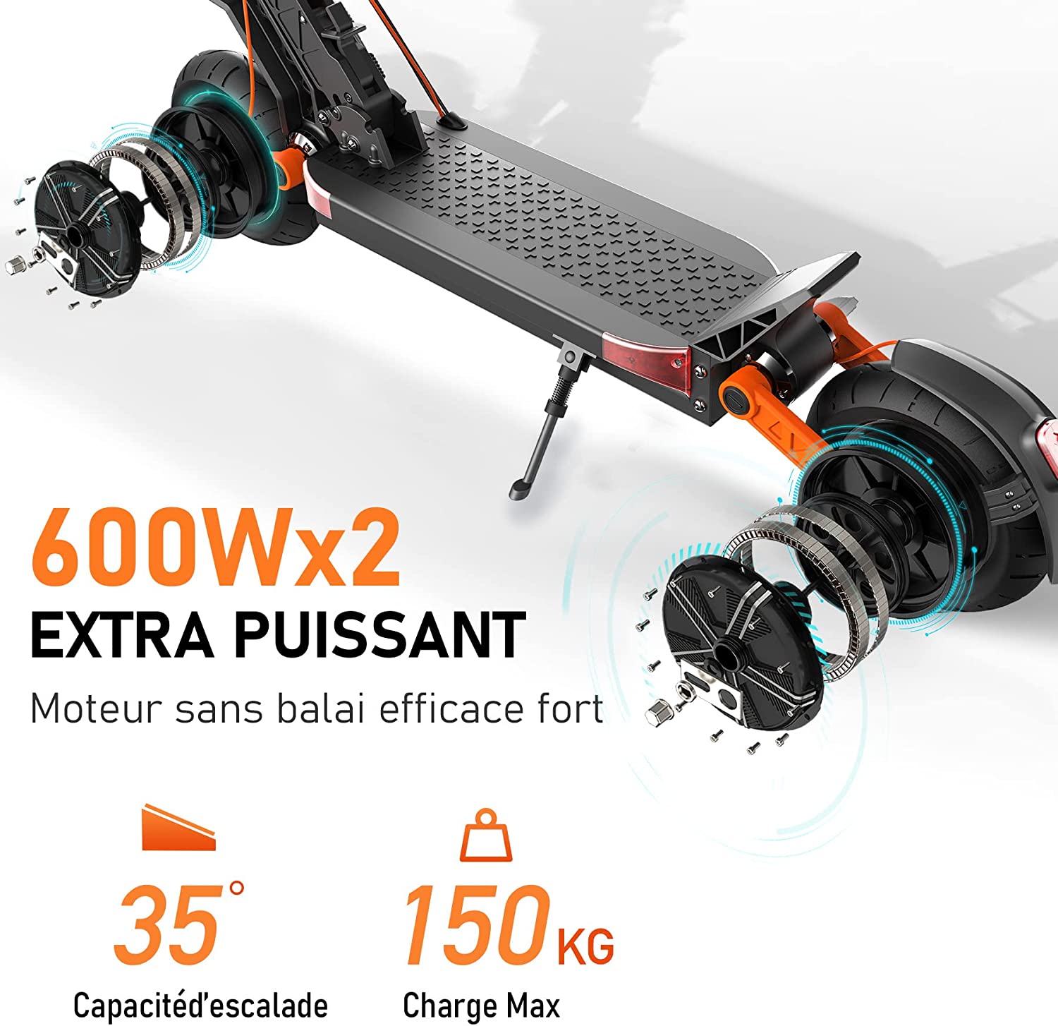 • 🛴【3 en 1】Passion & Fashion & Vitesse!Ce scooter électrique très beau a combiné toutes ces 3 spécialités.Intégrée de 2 moteurs puissants sans balais de 600W,soit une puissance totale de 1200W qui permet une accélération de vitesse plus rapide en vous donnant suffisant de puissance lors de la montée de pente.